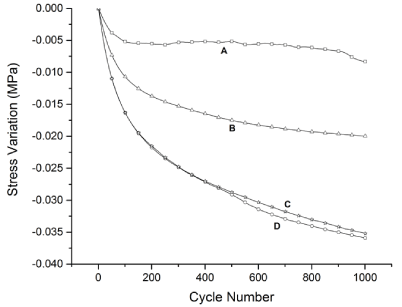 Figure 7. Fatigue test curves of pure PCL and PCL/FU tablets sintered using different power conditions: PCL 3W (A), PCL 7W (B), PCL/FU 3W (C), and PCL/FU 7W (D).
