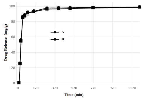 Figure 8. Fluorouracil release as a function of time for PCL/FU tablets manufactured using 3W (A) and 7W (B) of laser power.