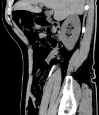 Figure 1. CT (sagittal view) showed the drill bit in the appendix.