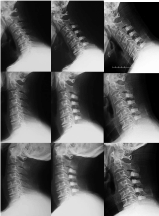 Figure 2. Plain radiographs 4 year after first operation showed obvious limitation of motion in C2-7 angle(0°) and exaggerated flexion at the C7/T1 segment (upper; flexion, center; neutral, lower; extension, left; preoperation, ROM28°, center; 1 year after first operation, ROM18°, right; 4 year after operation, ROM0°)