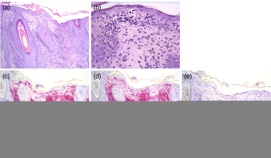 Figure 2. (a) Histologic sections illustrate increased numbers of pleomorphic T-lymphocytes with hyperchromatic and cerebriform nuclei present along the dermal-epidermal junction and perifollicular epithelium. (b) Significant epidermotropism and Pautrier’s microabscesses are identified, along with mild dermal fibrosis. (c) A CD3 immunohistochemical stain highlights these atypical T-lymphocytes within this infiltrate. (d) and (e) The CD4:CD8 ratio is elevated at a ratio of 15:1. These findings are consistent with mycosis fungoides. ([a] and [b], Hematoxylin-eosin stain; original magnification [a] 100x, [b] 200x. [c], [d], and [e] Immunostain for CD3, CD4, and CD8, respectively; original magnifications: 100x.)