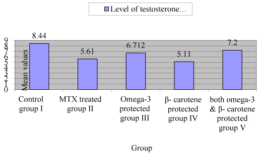 Testosterone level was significantly reduced in treated group with MTX-treated group (II) (p<0.05), however, testosterone level was increasing significantly in omega 3 fatty acids protected group(III) rather than β carotene protected group (IV) (Figure 1).