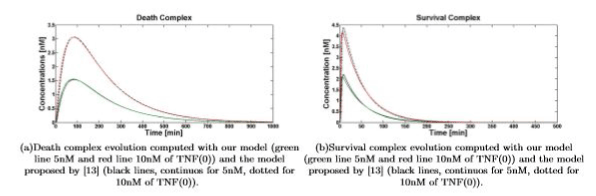 Simulations show that even if dramatically simplified, the proposed model inherited the significant properties of the more detailed model presented in [13]. Figures 4(a) and 4(b) show the comparison between the temporal evolution of the death and survival complexes simulated with either our model or model [13], computed for 5 and 10nM of TNF (0). The two models keep agreeing at different TNF (0) values.