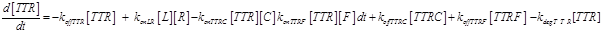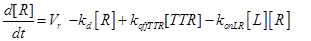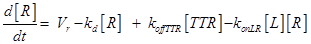 The term −konLR[L][R] describes the association between TNF and its free receptor. The minus sign is because the association between these two components decreases the concentration of free TNF and TNFR1. The same term is also present in eq (2). The +koffTTR[TTR] describes the dissociation rate of TTR and is present obviously with “+” sign also in eq (2) and with “-” sign in eq.(3) for the reasons just explained above.