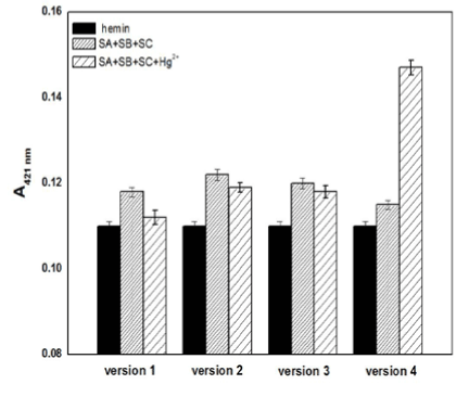 It is imperative for the proposed Hg2+ sensing strategy to demonstrate that without the target Hg2+, the free forms of SB and SC would not construct the G-quadruplex even in a semi-stable state, which would result in a high background and false response. To meet this requirement, four versions of SA, SB, and SC with different base sequences and lengths were carefully designed to ensure that the intermolecular split G-quadruplex DNAzyme was constructed only in the presence of Hg2+. As shown in Figure 2, the black bars, sparse bars and dense bars represent the absorption signal of free hemin, the mixture of the MNPs-SA, SB, SC, and hemin with and without Hg2+, respectively. All dense bars in Figure 2 were a little higher than the black bars to different extents, exhibiting the liable G-quadruplex might be formed in the absence of mercury ions. The complementary G-C base pair of the SA strands between their corresponding SB or SC are 50% (version 2 and 4), 62.5% (version 1) and 66.7% (version 3), which can incline SB and SC to become close to each other by partial hybridisation and the formation of an unstable G-quadruplex. Except for the fourth version, all of the absorbance signals in the presence of Hg2+ (sparse bars) were slightly lower than the signals without Hg2+ (dense bars), indicating that the lesion of the intermolecular split DNAzymes occurred due to the intercalation of mercury ions loosening the G-quardruplex. The sparse bar of version 4, which is much higher than the signals of free hemin and the mixture without Hg2+, indicates that only the fourth version is consistent with the Hg2+-sensing mechanism as we expected. In four versions, the shortest strands are the SA1 and SA2 strands, both of them having 16 bases, and SA3 is the longest with 24 bases, while the SA4 is in the middle with 20 bases (Table 1). The rise of the sparse bar in version 4 demonstrates that the liable state G-quadruplex DNAzymes would be stabilised in the presence of mercury ions with the strands of the sandwich (SA, SB and SC) having a suitable number of G/C and T-T mismatched bases in the appropriate length.
