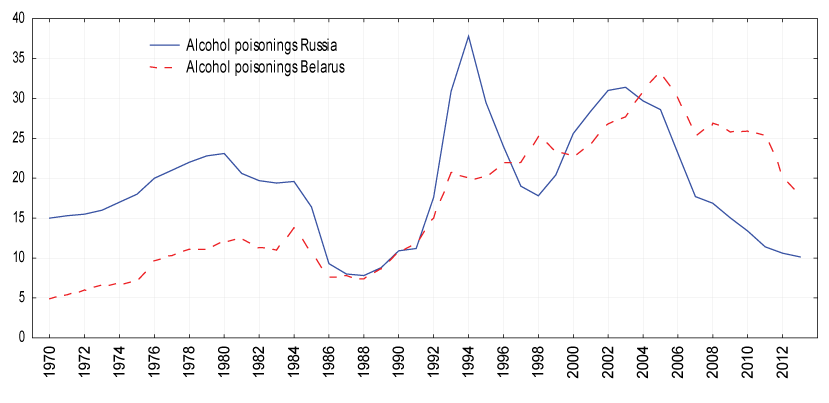 Some researchers attributed the Russian mortality crisis between 1992 and 1994 to the group of heavy drinkers, whose lives were saved during the anti-alcohol campaign [8]. It was also suggested that mortality in this group explains the subsequent fluctuations in total mortality. However, the substantial discrepancies between the trends in alcohol poisoning mortality rates in Russia and Belarus during the recent decades do not support this hypothesis.