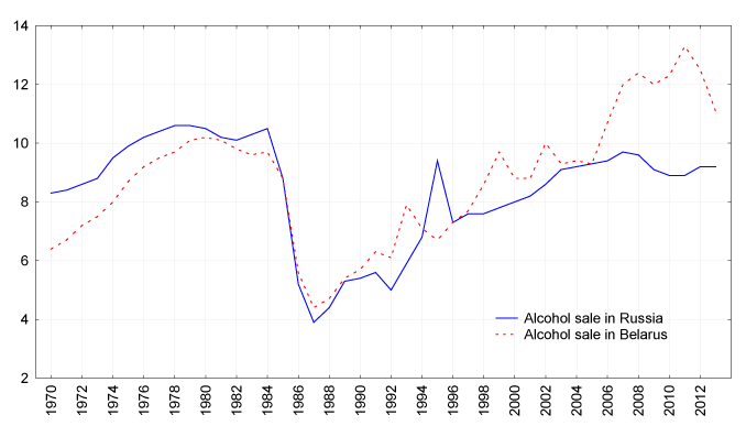 Figure 4. Trends in alcohol sales per capita in Russia and Belarus between 1970 and 2013.