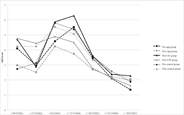 Whether the intervention groups showed reductions in acute and chronic stress levels, both on a subjective as well as objective level, four repeated-measures ANOVAs (pre- vs. posttest) and group (anti-stress-app vs. face-to-face vs. control group) as between-subjects variables were conducted. The significance level was set at p < .05.