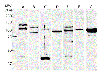 Immunoprecipitation assays were performed in order to evaluate the possible interaction of E-cadherin with the other proteins of the CCC. E-cadherin was immunoprecipitated from total cell lysates of FMCm cells and western blot analysis for P-cadherin and p120, α- and β- catenins was performed (Figure 4). The results demonstrated that along with E-cadherin it was possible to detect the presence of each one of the catenins as well as P-cadherin (Figure 5), indicating that E-cadherin interacts with all these molecules. Furthermore, the P-cadherin western blot analysis of E-cadherin immunoprecipitates identified the P-cadherin at a lower molecular weight (approximately 80-90 kDa) when compared with the expression of P-cadherin in the total cell lysate (of 120 kDa). This result was very consistent in all the experiments. Despite many improvements in the immunoprecipitation protocol, a clear negative control for p120-catenin western blot after E-cadherin immunoprecipitation was not achieved. This probably suggests that the rabbit immunoglobulins used in the negative control have some cross reactivity to feline p120 protein.