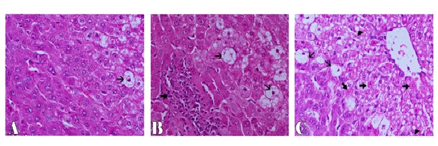 Figure 2. Liver of rabbit showing ballooning degeneration of few hepatic cells (thin arrow) in CCl4+silymarin group (A), focal mononuclear inflammatory cells aggregation (thick arrow) and ballooning degeneration of some hepatocytes (thin arrow) in CCl4+100 mentha group (B), ballooning (thin arrows), fatty degeneration (arrowhead) and apoptosis of hepatocytes (thick arrows) in CCl4+50 mentha group (C). H&E stain X200.