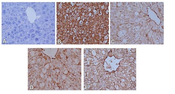 Figure 4. Immunostained liver sections for iNOS showing no expression of iNOS in control group (A); marked expression of iNOS in CCL4 intoxicated group (B); weak expression of iNOSin pretreated groups with silymarin (C), 100 mg Mentha (D) and 50 mg Mentha extract (E). (400X).