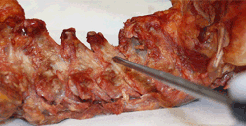 Seven fresh frozen human cadaveric cervical spines were used in this study with mean DXA T-score −0.6 and with a STD of 2.8. Five additional specimens were excluded from the study due to DXA T-scores<−2.5; set in attempt to exclude specimens with poor bone quality. Fourteen subaxial cervical spinal motion segments were instrumented. 2 Motion segments were instrumented, at C3-4 and C5-6 were instrumented alternately between lateral (LM) and spinolaminar (SL) screw fixation which allowed us to control for specimen-to-specimen variation in BMD.