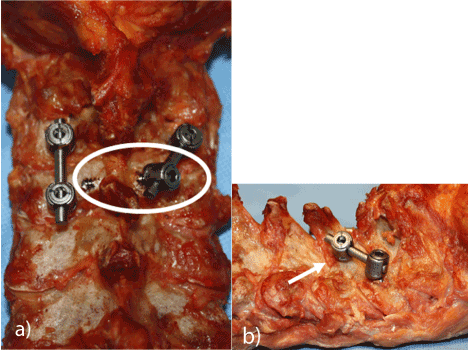 However, there are situations when standard lateral mass screw placement is not possible. Such instances include: lateral mass screw cutout, lateral mass fractures, bony defects, and revision fixation secondary to screw loosening or malposition [6-8]. In these situations, salvage techniques are required to achieve cervical fixation. Several options exist for salvage fixation of the cervical spine such as adding extra levels of fixation, anterior fixation, spinous process wiring, cervical pedicle screw placement, interlaminar screw placement, and trans articular revision screw placement. Each of these salvage options has its own drawbacks. Adding extra levels for fixation will likely require those additional levels to be fused. Anterior plate fixation and posterior wiring constructs are not nearly as rigid in flexion or torsion as posterior screw/rod or hook/rod constructs [1,9], and may require additional surgical approaches.