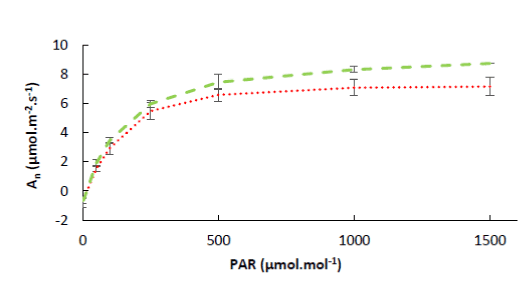 Figure 4. The average photosynthesis light response curve of apple trees (‾ ‾) and tomato plants (.....) (n=36).