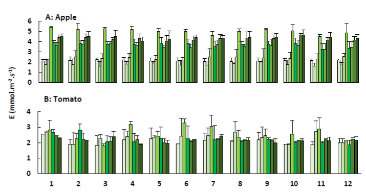 As long as water is not the limiting factor, plants will diminish their leaf temperature by transpirational cooling [23,24]. As evaporative demand increases, stomata tend to close to reduce the rate of water loss, resulting in reduced photosynthesis [25]. Overall, the stomata are regulated to maximize carbon gain and minimize water loss [26]. Figure 6 illustrates the measured transpiration rates for the apple trees and tomato plants, observed when measuring the net photosynthesis.