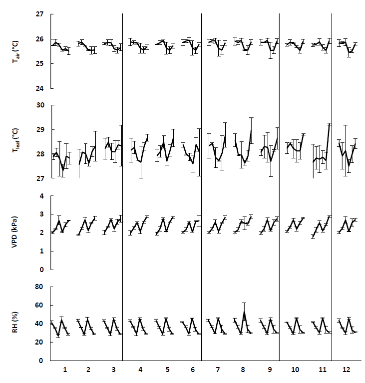 Figure 9. The ambient parameters, i.e., air temperature (Tair), leaf temperature (Tleaf), vapour pressure difference (VPD) and relative humidity (RH), involved during the measurements on treated tomato plants (Table 1). The different data points per treatment indicate the mean (+ SE) of different measurements during 4 weeks (n=5).