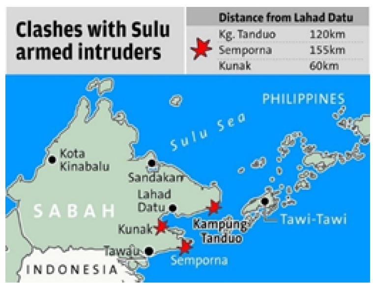 A military conflict in Lahad Datu, Sabah started from 11th February 2013 and ended 24th March 2013, involved a self-declared throne of the Sultanate of Sulu, making a territorial claim of Philippines. Lahad Datu is a district in the East of Sabah, Malaysia, located approximately 165 km from Tawi-Tawi, Philippines (Figure 1). The confrontation between the self-declared Royal Security Forces of the Sultanate of Sulu and North Borneo and the Royal Malaysia Police (RMP) had caused 54 Sulu Sultanate armies and 10 Malaysians were sacrificed. During the captive, 4 Malaysian policemen were tortured and mutilated with one beheaded. At the end of the battle, the affected villages were then declared safe from threats and secured by the Eastern Sabah Security Command. The relevant authority and the DVI team were assembled and Lahad Datu Hospital was set up as the DVI mortuary operation centre (Figure 2). Dead bodies were being recovered from the conflict areas, however, were badly decomposed. Most of the bodies were already collected and piled up by the villagers. The DVI expert team, comprised of the forensic pathologist, forensic anthropologist, forensic odontologist, fingerprint expert as well as the DNA expert were mobilised and deployed to Sabah for the postmortem examination. The mortuary operation lasted for one month.