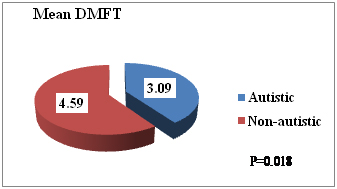 The mean DMFT of the non-autistic group was higher than that of the autistic group, 4.59 and 3.09 respectively. The difference between the two groups was significant (p=0.018) (Figure 2).