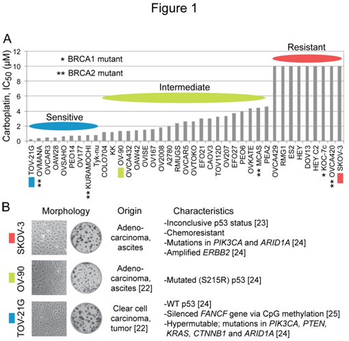 Figure 1. Diversity in carboplatin sensitivity among EOC cell lines, and characteristics of SKOV-3, OV-90 and TOV-21G cells employed in the study. Panel A, the bar graph was generated using the reported IC50 values for carboplatin in a panel of 39 EOC cell lines [26]. Panel B, the information about the origin, phenotypes and mutations in each cell line were collected from ATCC catalog and earlier reports [22-25].