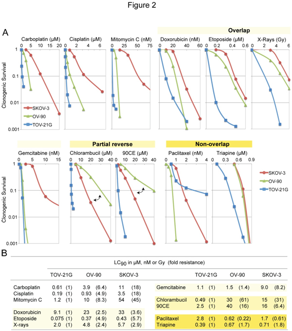 Based on the survival curves, and LC90 values presented in Figure 2A and 2B, anticancer agents werecatalogedaccording to their effectiveness against platinum-sensitive TOV-21G, platinum-intermediate OV-90and platinum-resistant SKOV-3 (Figure 5A).Mitomycin C stands out for its effectiveness against FANCF-deficient TOV-21G with greater potency and selectivity than carboplatin, while paclitaxel and triapine are prominent for their effectiveness against bothplatinum-sensitive and platinum-resistant EOC cells. Figure 5B summarizesthe primary sites of action and cytotoxic mechanismsofcarboplatin/mitomycin C, triapine and paclitaxel that form the basis of theirunique cytotoxic properties.This issue is addressedfurther in the discussion section.