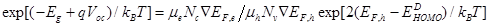thus obtained depends on the energy difference between the highest occupied molecular orbital (HOMO) level and the quasi-Fermi level of holes of the donor material and on the ratio of the electron (