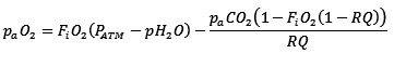 Where paO2 is partial alveolar pressure of oxygen, FiO2 is the fraction of inspired oxygen, PATM is the atmospheric pressure, pH2O is the vapor pressure of water, paCO2 is the partial alveolar pressure of carbon dioxide and RQ is the respiratory exchange ratio [14,15]. We utilized atmospheric pressure measurements at the time of resuscitation as recorded by the respiratory function monitor NM3 (Respironics, Philips, Andover, MA). Where values were missing, the mean (SD) of measured pressures was used 701 ± 1 mmHg. We constrained the value for partial alveolar pressure of carbon dioxide and RQ to 40 mmHg and 0.8 respectively, based on accepted physiological generalizations [15,16]. The vapor pressure of water was constrained to 47 mmHg, an estimated value for vapor pressure at 37°C [15]. The partial alveolar pressure of oxygen was the calculated for FiO2 of 0.21 and 1.0.