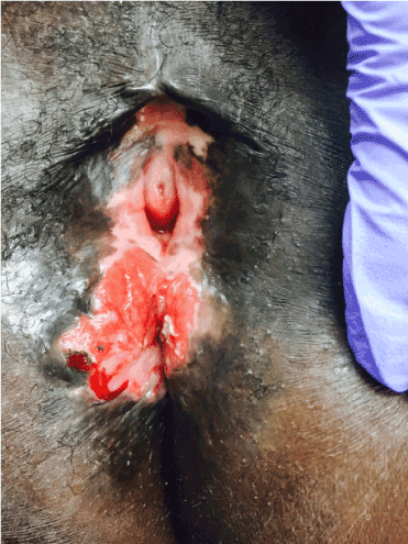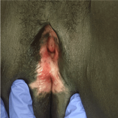 A 35-year-old African American woman with known vertically transmitted HIV infection diagnosed at age 16 presented to the gynecologists with a chief complaint of a non-healing vulvar ulcer of over 2 year duration. Examination revealed a 4x4cm non-tender and non-pruritic vulvar ulcer with indurated borders (Figure 1). Areas of depigmentation, atrophic labia minora, small stenotic vaginal introitus and a scar on the clitoris are also visible on the external genitalia. In June 2014 absolute CD4+ count was 490-1740 cells/uL and Herpes Simplex Virus (HSV) immunostain of the ulcer was positive. Patient was on highly active antiretroviral therapy (HAART) during this time. Patient was instructed to avoid sexual intercourse and she was put on Acyclovir 400 mg PO three times daily and acyclovir cream. The ulcer healed and she was left on acyclovir 400 mg PO daily as suppressive therapy and is responding well.