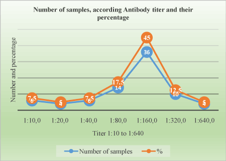 The Ab titer for positive samples ranges from 1:10 to 1:640. The table shows the proportion of samples according to antibody titer (Table 3).