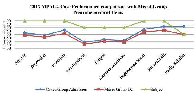 The first comparison sample (n = 41) represents a mix of neurobehaviorally involved brain injury patients with complex medical conditions that interfere with neurological functions such as seizure disorder, metabolic disease, and brain tumors. This sample best represents the complexity and the diversity of this individual’s presentation because he has mixed medical, neurological and neurobehavioral sequelae. The second group (n = 30) is a chronic traumatic brain injury sample with neurobehavioral impairments without the conditions of the first clinical group. The second group was used to establish the magnitude of disability for a well-researched neurologically impaired matched group. Both groups were similar in presentation based on MPAI-4 scores due to the chronicity falling >4 years post-injury, and provide benchmarks for admissions and discharge disability ratings. This, thereby, provides a benchmark for comparing the case with a comparably injured mixed diagnosis group.