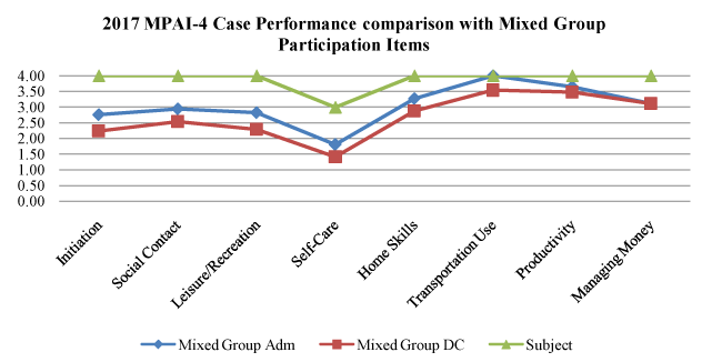 With inclusion criteria establishing comparability of the two groups on demographic variables, we were then able to examine the impact of the diagnostic condition of the subject on outcomes. This analysis allowed for comparison of the case subject on all 29 items of the MPAI-4 with the mixed neurologic sample. The mixed sample was only used in this analysis due to the similarity of diagnosis with the case subject. The overall result revealed that the subject’s disability rating was higher than the mixed neurologic clinical sample on virtually all of the MPAI-4 items. In addition, each of the 29 items revealed a complex presentation of impairment across physical, cognitive, communication, neurobehavioral, and instrumental activities of daily living skills, which was consistent with prior research prediction.