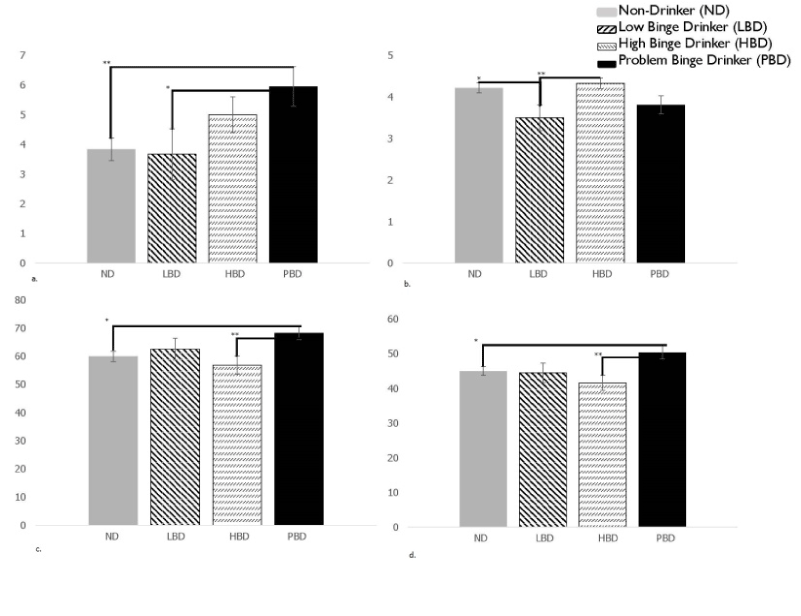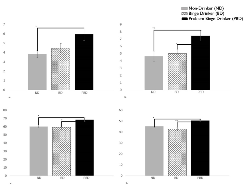 A multivariate analysis of variance (MANOVA) was used in order to evaluate differences between three groups (ND, BD, PBD) and the potential effects the current variables had on the other outcome measures. In order to explore differences within binge-drinkers further, a second MANOVA was used (groups: ND, LBD, HBD, PBD). Significance was set with alpha level .05 using Wilks’ Lambda effects.