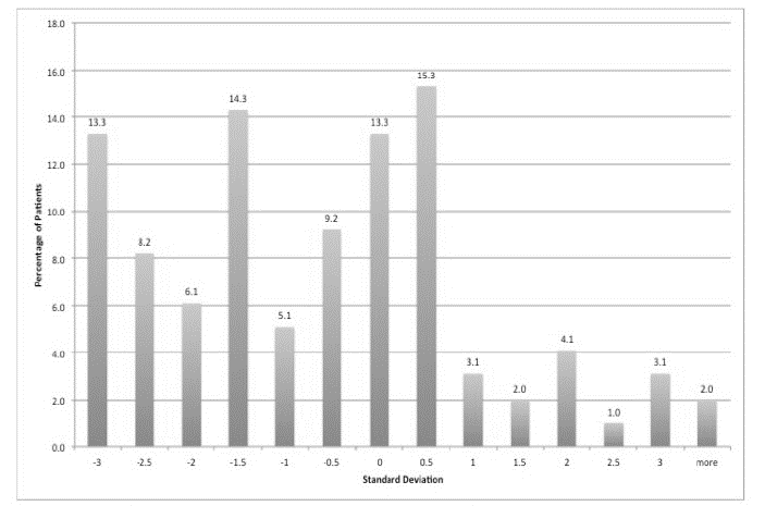 Figure 1: Short Term Verbal Memory AVLT. Showing 28% of patients were 2 SD or less than expected for age and gender adjusted means.