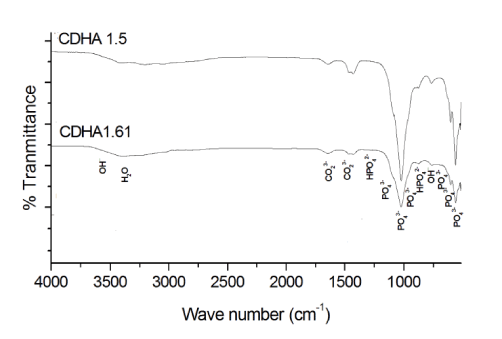 Figure 3: FT-IR spectra of CDHA1.61 and CDHA1.5 nanoparticles.