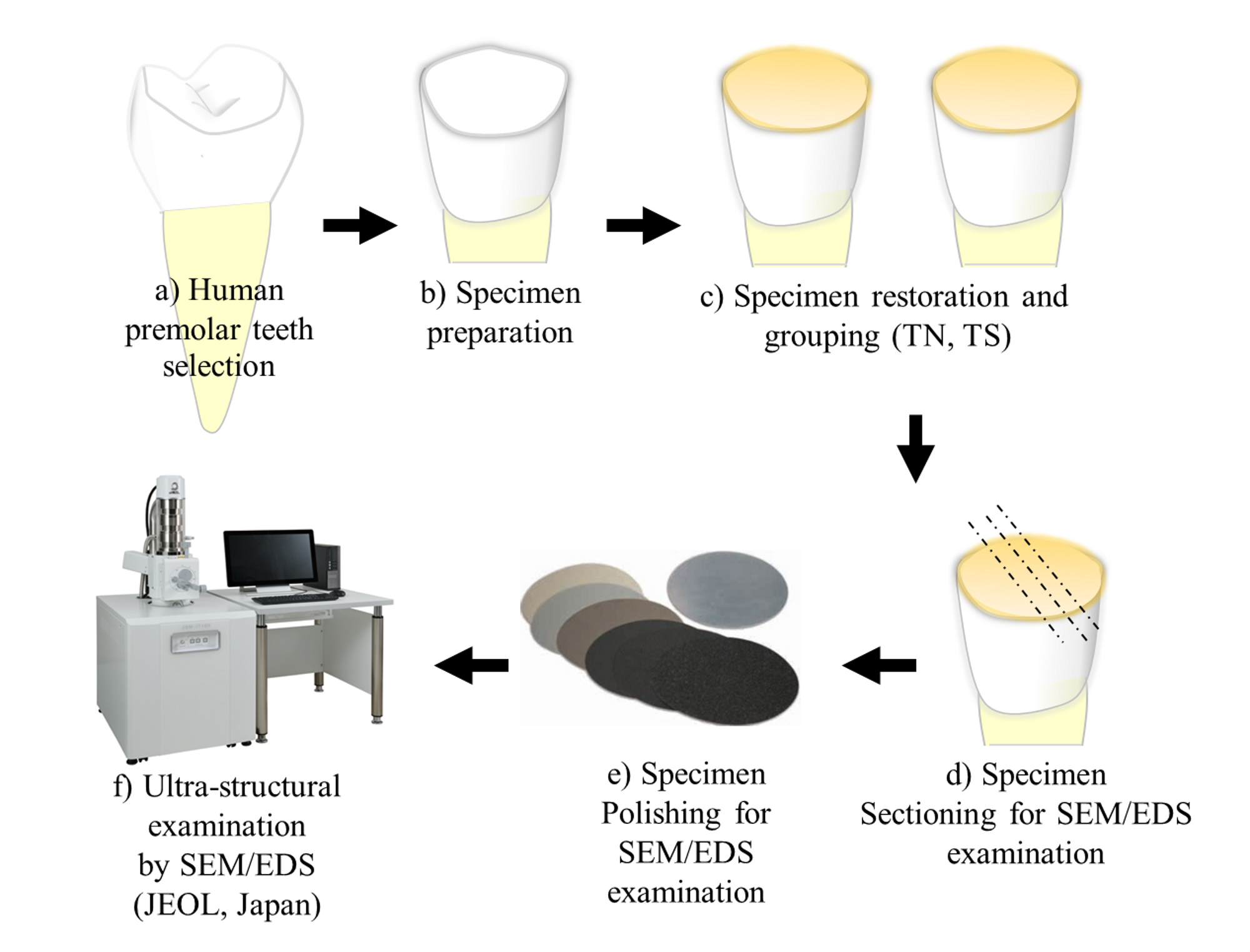 The teeth samples were divided into two experimental groups (TN, TS). Each group (n=5) was bonded with one of the adhesives (TN, TS) and light-cured according to the manufacturer instructions. Then, Clearfil Majesty Posterior (Kurary Noritake, Japan) resin composite was placed on the occlusal surface in two layers, each within 1.5 mm thickness. Each composite layer was light-cured according to the manufacturer’s recommendations using LED light cure (1200mW/cm2).