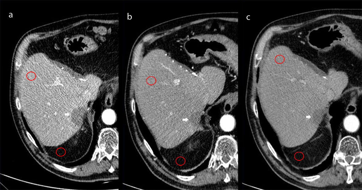 Contrast-to-noise ratio (CNR) was calculated using background attenuation values and noise from the abdominal fat at each arterial level as: CNR = (HUvessel − HUliver)/[(SDfat).