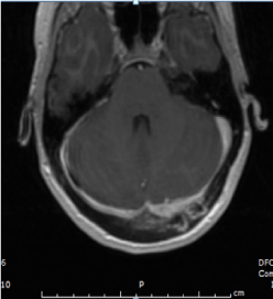 Figure 2. MRI brain showing osteomyelitis within the overlying occipital bone.