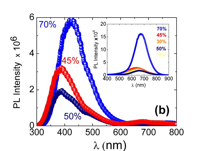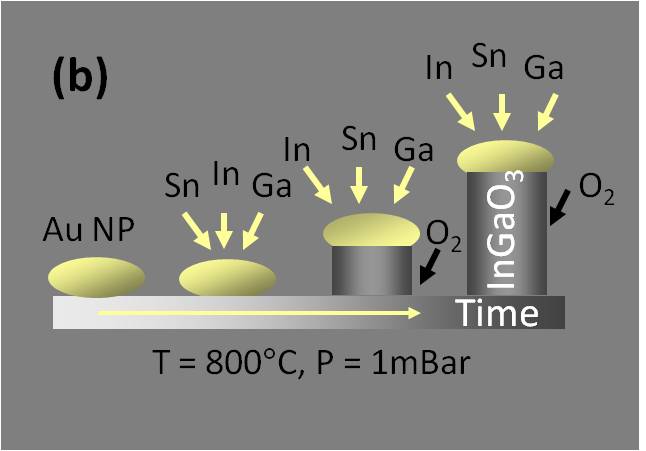 Here we have grown Sn doped In2xGa2-2xO3 NWs by LPCVD at 800°C and 1 mBar using Sn , In and Ga metal sources containing 13, 30, 35, 40, 50, 70, 75 % Ga and only 1% Sn. The vapor pressures of In and Ga at 800°C are » 10-4 and 10-5 mBar respectively while In and Ga have similar ionic radii which renders feasible the compositional tuning of In2xGa2-2xO3 NWs. We obtained a high yield and good uniformity of In2xGa2-2xO3 NWs with average diameters of » 50 nm and lengths up to 100 mm. A typical SEM image is shown in Figure 1a. We find that the In2xGa2-2xO3 NWs do not grow on plain Si so one dimensional growth occurs via the VLS mechanism, as depicted schematically in Figure1b, similar to Sn doped In2O3 where it has been shown that the Au nanoparticles at the top of the Sn doped In2O3 NWs are in fact rich in Sn not In [20]. The In2xGa2-2xO3 NWs exhibited clear peaks in the XRD as shown in Figure 2 from which they appear to consist of a mixture of phases belonging to the binary constituent components i.e. the cubic bixbyite crystal structure of In2O3 and monoclinic b-Ga2O3. There are few reports on the synthesis of pure In2xGa2-2xO3 and the highest conductivities have been obtained using Sn as a dopant [21]. Solid solutions of In2xGa2-2xO3, where x < 0.4, has been shown to result in indium substitution into the β-Ga2O3 lattice, while x > 0.95, results in gallium substitution into the cubic In2O3 lattice. For 0.4 < x < 0.95 phase segregation occurs and results in β-Ga2O3 and an In2O3-Ga2O3 phase with the cubic In2O3 structure [22]. It is worthwhile pointing out that the structural, electronic, and optical properties of In2xGa2-2xO3 have been determined recently by hybrid density functional methods and it has been shown that the structure of In2xGa2-2xO3 is similar to β-Ga2O3 but it is distinct from Ga doped In2O3 [23]. We find that the XRD spectra of the In2xGa2-2xO3 NWs obtained using 25 to 70% Ga contain a few weak, but nevertheless well resolved peaks, that do not belong to In2O3 or b-Ga2O3 as shown in Figure 2 but must belong to a Ga rich In2xGa2-2xO3 phase since they do not correspond to SnO2. Before elaborating further, it is worthwhile pointing out that we tried to grow In2xAl2-2xO3 NWs via the VLS mechanism but we found from high resolution XRD that the Al was not incorporated in the crystal lattice of In2O3 due to the large difference in the ionic radii of Al and In but also due to the fact that Al has a very large affinity to oxygen which is known prevent one dimensional growth via the VLS mechanism [24]. Besides we did not observe a mixture of In2O3 and Al2O3 phases in the XRD and did not detect more than 1% Al by energy dispersive x-ray analysis (EDX) which is different to the case of the In2xGa2-2xO3 NWs. A typical EDX spectrum obtained from the In2xGa2-2xO3 NWs obtained with 25% Ga is shown in Figure 1c from which we observe distinct peaks belonging to In and Ga. This clearly shows that the In and Ga are incorporated in the In2xGa2-2xO3 NWs while the % at. content of In and Ga in the In2xGa2-2xO3 NWs obtained using metal sources containing different ratios of In to Ga is shown as an inset in Figure 1(c). It is evident that one may tune the actual composition of the In2xGa2-2xO3 NWs over a broad range in contrast to the case of In2xAl2-2xO3 NWs. These findings are similar to the case of Sn doped In2O3 NWs where we showed that it is possible to tune the crystal structure from cubic bixbyite In2O3 to tetragonal rutile SnO2 via a regime consisting of a mixture of In2O3 and SnO2 [4]. Recently we showed that the same is also true for Sn doped Ga2O3 NWs. Both Sn doped In2O3 and Sn doped Ga2O3 NWs were grown by LPCVD at 800°C and 1mBar which are exactly the same growth conditions used for the growth of the Sn doped In2xGa2-2xO3 NWs. The ability to tune the composition of the In2xGa2-2xO3 NWs is attributed to the fact that its constituent binary oxide components can be grown using exactly the same growth conditions and Sn as a dopant but also due to the similar ionic radii of In and Ga. A schematic illustration of the VLS growth mechanism is shown for completeness in Figure 1b. All of the In2xGa2-2xO3 NWs showed PL with a maximum between 350 nm to 400 nm as shown in Figure 3a and a tail extending to 500 nm which is attributed to the existence of oxygen vacancies and states lying energetically in the upper half of the energy band gap of the In2xGa2-2xO3 NWs, as shown previously using ultrafast absorption transmission spectroscopy in the case of the b-Ga2O3 or In2O3 MO NWs. Interestingly we find that the PL of the In2xGa2-2xO3 NWs grown using more than 30 % Ga is slightly blue shifted, which is consistent with a change in the composition of the In2xGa2-2xO3 NWs from In to Ga rich and results into an increase in energy band gap. More specifically the PL has a maximum at 400 nm or 3.1 eV for 10 to 30% Ga but shifts to 350 nm or 3.5 eV above 30% Ga which is close to the experimental energy band gaps of bulk In2xGa2-2xO3.