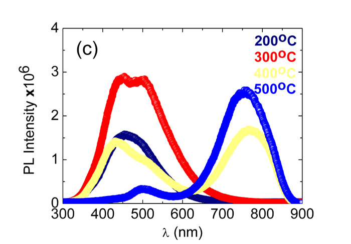 Figure 3a. Room temperature PL of as-grown In2xGa2-2xO3 NW obtained using different % Ga content metal source (b) Room temperature PL of  In2xGa2-2xO3  NWs after processing under H2S at 500°C ; inset shows the PL after processing under H2S at 700°C (c)PL of chalcopyrite Cu(InxGa1-x)S3 NWs obtained by deposition of 40 nm Cu over the In2xGa2-2xO3  NWs grown using 30% Ga and processing  under H2S at 200°C, 300°C, 400°C and 500°C.
