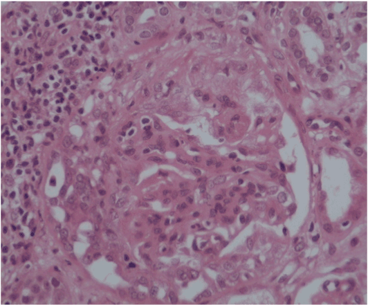 Methylprednisolone (1gm daily) was injected intravenously for 3 days followed by 60mg/day oral prednisolone and mycophenolate mofetil 1gm twice daily. This treatment resulted in rapid improvement in renal function, where proteinuria came to less than 150 mg/24 hours and serum creatinine dropped from 4.5mg/dl (eGFR 14 ml/min) to 2.6mg/dl (eGFR 27 ml/min), without dialysis support despite the presence of few crescentic and sclerosed glomeruli, and the interstitial inflammation with tubular atrophy. The patient was maintained on 5mg/day prednisolone and 500mg twice daily mycophenolate mofetil before discharge. Unfortunately, patient didn’t maintain his outpatient clinic follow up appointments and was not seen again.