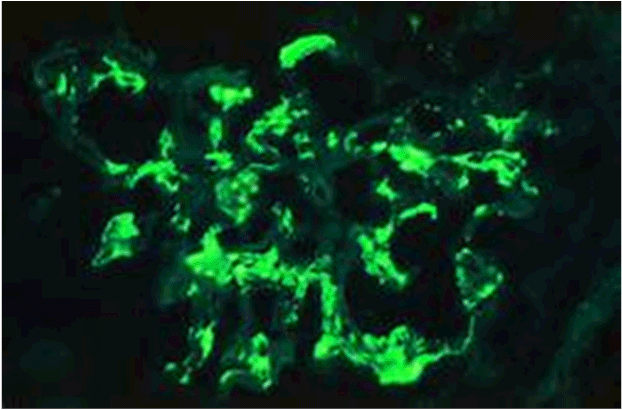 The patient was asymptomatic with normal vital signs (pulse 78/min, BP 132/78 mmHg, RR 18/min, temperature 37◦C) and in stable general condition. He had a history of controlled type 2 diabetes mellitus for 10 years (HbA1c 7%) and hypertension for 3 years, but there was no past history of renal disease or family history of kidney disease. There was no recent systemic viral or bacterial infection, no recent blood or fluid loss, and no recent exposure to nephrotoxic drugs or radiocontrast agents. Funduscopic examination revealed no diabetic or hypertensive retinopathy. Ultrasound examination showed normal size kidneys with no focal dilated collecting system and no significant post-residual urine volume. His initial urine analysis showed RBCs 3-4/hpf and albumin was +++. Serum creatinine was 4.5 mg/dl (eGFR 14 ml/min) and proteinuria 400 mg/24hour urine collection. Serum IgA level was within normal range (68-432 mg/dl). His serology reports revealed negative ANA, anti-DNA, ANCA, and anti-GBM antibody, but slightly decreased C3 and normal levels of C4. Immunoglobulins and cryogolbulins were within normal limits, HBsAg, antibodies to HCV and HIV were all negative. Repeated urine analysis showed 25 pus cells, 3+ proteinuria and many RBCs/hpf. The pus cells, and RBCs, indicated urinary tract infection, possibly due to Foley’s catheterisation. Urine culture and sensitivity revealed Proteus bacterial growth which was sensitive to imepenem. Repeated urine analysis showed no pus cells and urine culture showed no growth following treatment with a course of imepenem. His blood pressure was controlled (127/78 mmHg) with angiotensin converting enzyme inhibitor (Perindopril 5mg OD). The sudden, rapid and unexplained deterioration in renal function, and the absence of diabetic and hypertensive retinopathy, the decision for a diagnostic renal biopsy was taken. The patient was bed-bound due to fixed flexion deformities of lower limbs and deformity of left arm, and it was difficult to perform a renal biopsy in a suitable position. However, a week later and under effect of sedation, a real time renal biopsy was performed in right lateral position under ultrasound guidance. Post-procedural condition of the patient was uneventful. Light microscopy showed 32 glomeruli with prominent mesangial proliferation, fibrocellular crescent formation in 4 glomeruli, 2 glomeruli were sclerosed, and there was moderate degree of interstitial inflammation and tubular atrophy (Figure 1a and 1b). The immunofluorescent stained sections showed focal mesangial and capillary wall deposits for IgA and C3 (Figure 2).