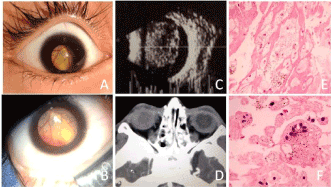 Figure 2. A,B) OD clinical leukocoria C) Ultrasound B-Mode showing an intraocular mass with no evidence of calcification D) Axial computed tomography with OD intraocular isodense occupative mass E,F) Histopathologic features revealed numerous foamy histiocytes and absence of neoplastic cells (Coats´ Disease) (H&E, x20, x40).