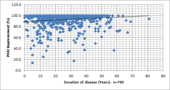- A negative association was found between PASI% and age at onset of disease: patients who started earlier in life their diseases were more likely to reach PASI 90.
