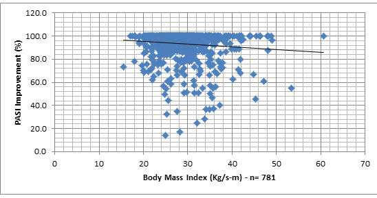 In the records examined, we found that 719 patients (91%) reached PASI improvement of 75% and we choose them as our study population. 70.2% were males, 78.1% were with skin photo type III (following Fitzpatrick classification) and the means of age and Body Mass Index reached respectively 51.2 years and 28.8 Kg/s-m.