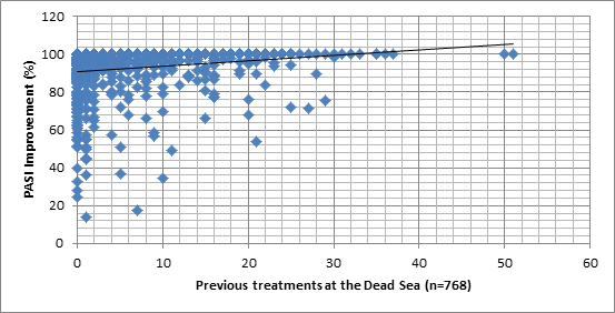 Based on these observations, one can explain our results as a consequence of a more effective treatment, involving many aspects of the management of this chronic disease and acting on many levels. Noteworthy, the three parameters that better correlate PASI 90 do not correspond to the disease severity, but rather to the chronicity of the psoriasis. Indeed, patients with numerous previous treatments at the Dead Sea and an early age at onset of disease can be classified as more chronic sufferers. Thus, it seems that Dead Sea Climatotherapy is more adapted for these patients, because of the availability of multi-factorial approaches of both disease and patient.