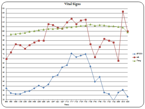 Surgery was uneventful for hours with vital signs within acceptable ranges based on initial measurements. At approximately eight hours post- surgery start time, the ETCO2 was noted to have increased from 37 to 45 mm Hg despite unchanged ventilator settings and continued paralysis. The minute ventilation was increased, but over the next hour the ETCO2 continued to increase to 57 mm Hg, the heart rate to 107 bpm, and temperature to 39.4°C. After noticing increasing premature ventricular contractions, a potassium level was checked and found to be elevated at 6.3 mEq/L. Treatment for hyperkalemia was started concomitantly with a widening QRS including IV calcium chloride, sodium bicarbonate, insulin, and glucose. The QRS reverted to normal. However, approximately 20 minutes later, the patient became hemodynamically unstable with again widened QRS complexes noted on ECG. At this point the ETCO2 was 75 mm Hg and temperature 40.5°C. Treatment for MH was initiated consisting of stopping sevoflurane, removal from the ventilator, hyperventilating with Ambu bag on 100% oxygen, propofol infusion, and insertion of a radial arterial line. The temperature probe was moved to the esophagus and temperature confirmed. Dantrolene sodium was given as 2.5 mg/kg IV bolus followed by 20 mg boluses over the next hour totalling 280 mg. Twenty minutes after initiating dantrolene, the patient developed pulseless electrical activity (PEA). An arterial blood gas taken shortly before this showed pH 7.12, PaCO2 62 mm Hg, HCO3-1 15 mMol/L, base deficit 9.5 mMol/L, lactic acid 9.9 mMol/L and potassium 6.3 mEq/L. (Table 1) Cardiopulmonary resuscitation was started, 1 mg IV epinephrine and 1 mg IV atropine were given. Chest compressions were stopped approximately three minutes later following return of a palpable carotid pulse. After the patient was stabilized and dantrolene continued, the ETCO2 decreased from a maximum of 75 to around 30 mm Hg, temperature decreased to 37.7°C and the heart rate decreased from 115 to 90 bpm. In addition, the metabolic acidosis corrected. The graphic anesthetic record of vital signs is seen in Figure 1. The patient was packed with ice bags and transferred to the surgical intensive care unit (ICU) where dantrolene therapy was continued (1 mg/kg every 6hours for 2 days), hyperkalemia treated, and continuous renal replacement therapy initiated. Laboratory studies revealed creatinine phosphokinase (CPK) level of 2315 Units/L and positive urine myoglobin. The patient did well and was extubated on postoperative day two and was transferred to the inpatient ward on day three.