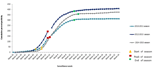 Table 1.Comparison of seasonal influenza activity, Ontario, 2010/11, 2012/13 and 2014/15 influenza seasons