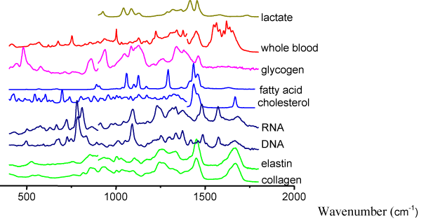 Figure 2. Examples of Raman spectra measured from a variety of human molecular constituents. Characteristic Raman peaks are seen for each substance at reproducible positions