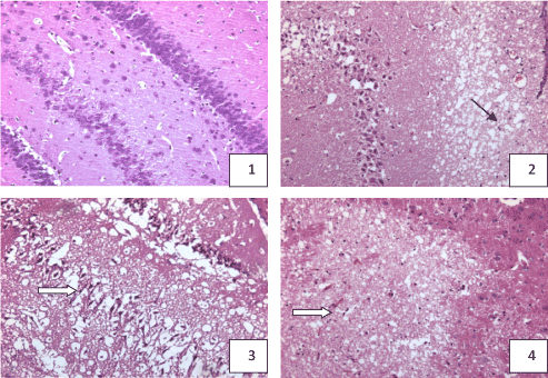 Figure 1. hippocampus and cortex pathologic change in the rat with acute multi-cerebral infarction (HE Staining × 100)