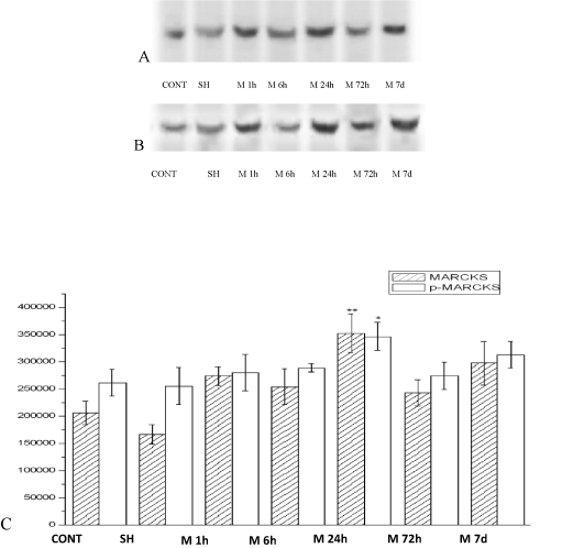 The MARCKS and p-MARCKS protein expression were surveyed by western blot technic. MARCKS and p-MARCKS protein were expressed in 1h after ischemia group (M1h), 6h after ischemia group (M6h), 24h after ischemia group (M24h), 72h after ischemia group (M72h), 7d after ischemia group (M7d) vs. Nomal group (CONT), Sham control group (SH) . The changes of MARCKS and p-MARCKS protein expression are identical. After acute ischemic, the expression are all increased, the expression of 1h start heighten, the expression of 24h is supreme, form dynamic changes. The expression of 24h obviously super other group (p<0. 01) (Figure 2).