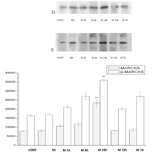 Figure 3. The MARCKS(D)、p-MARCKS (E) expression in rat cortex with acute multicerebral infarction .( ± s, n=6)